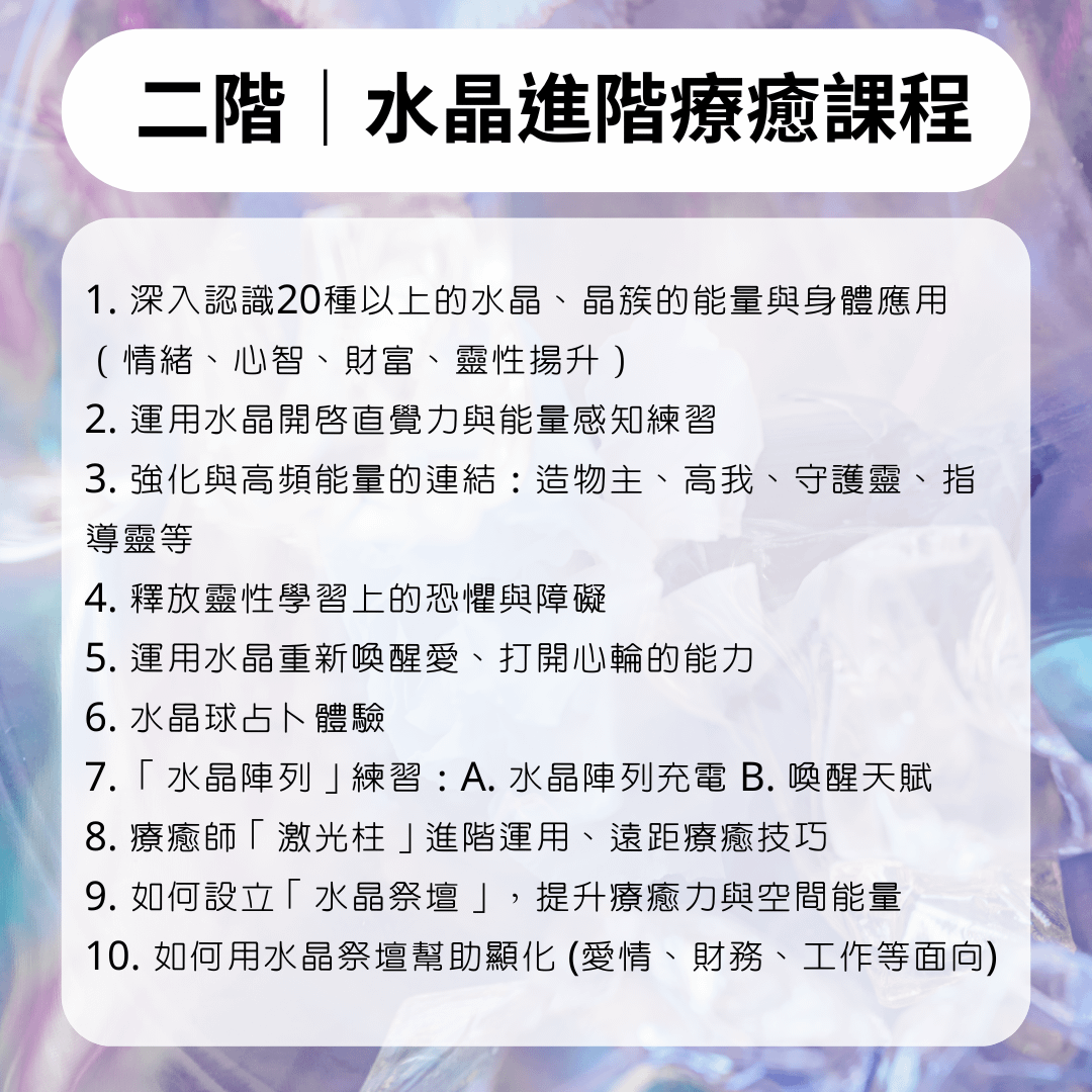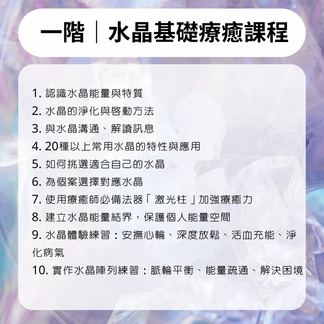 您可選擇參加單堂或完整兩階的課程,透過理論與實作結合,深入認識水晶能量的奧祕,成為真正懂得運用水晶的療癒者。跟著老師們由淺入深地走進水晶奧妙的世界: