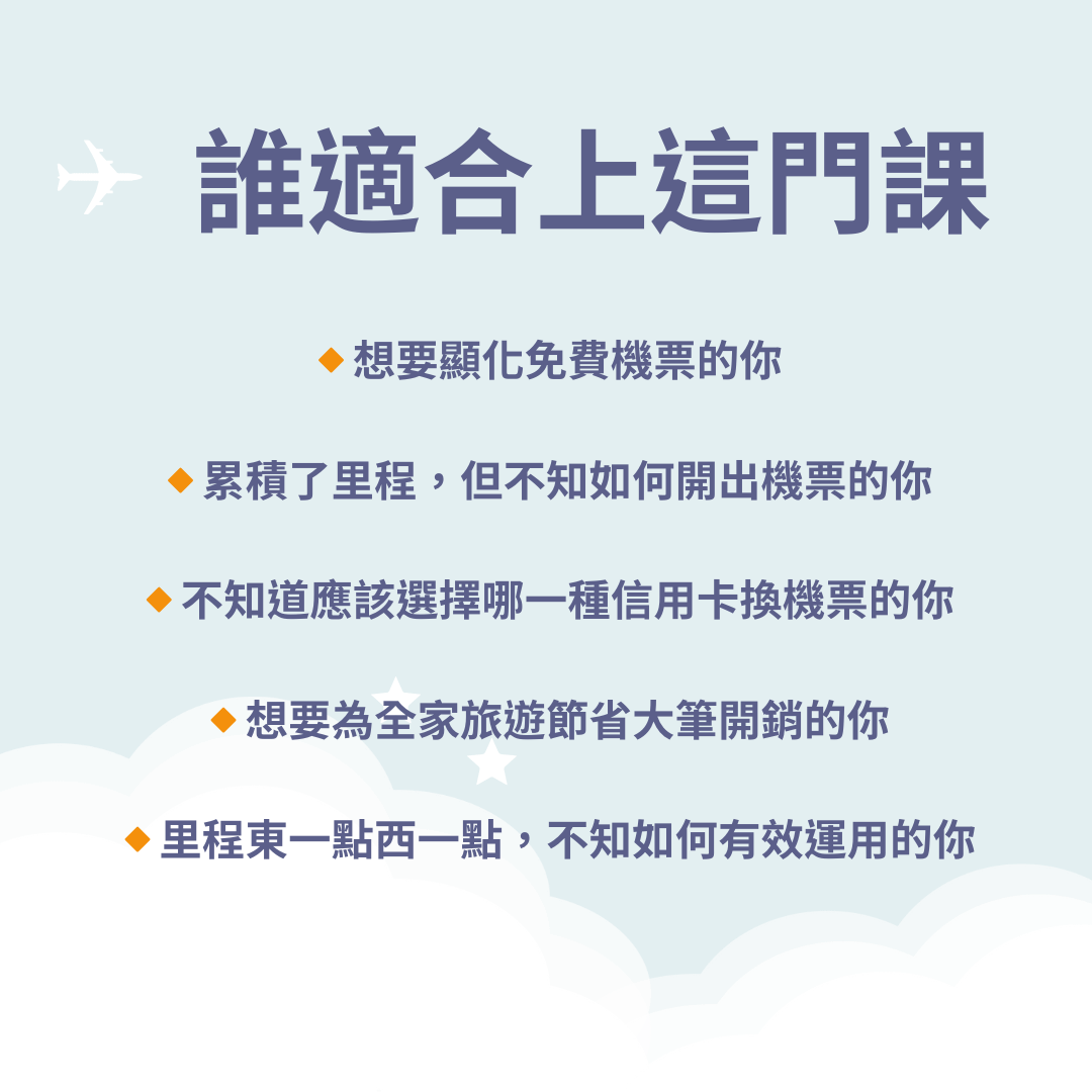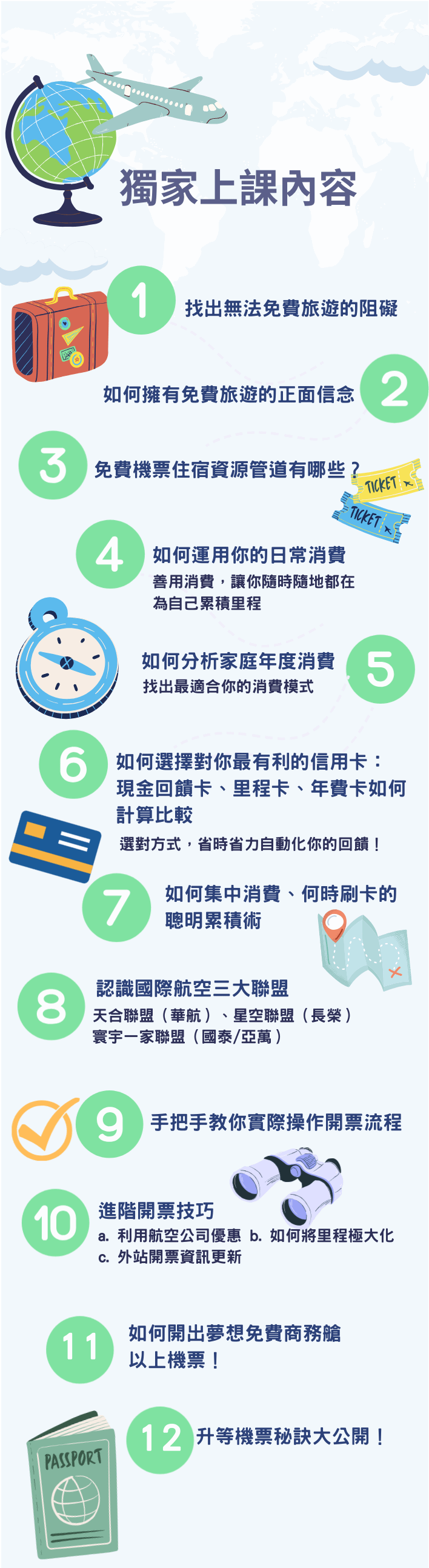 讓這堂課成為你享受免費機票的起點!把握機會儘早加入課程,只需上過1次課程就能獲得一生都受用的開票思維。
