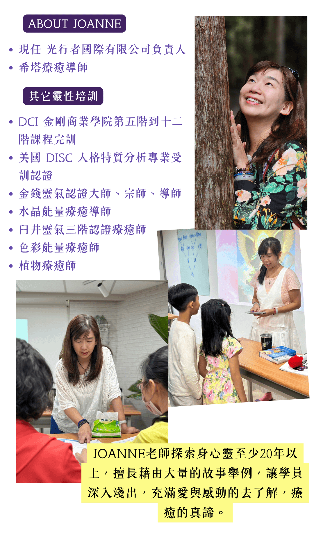 Joanne老師曾在科技、教育、顧問、直銷、健康醫療產業服務,擁有跨領域的實戰經驗,奠定療癒事業的基礎。探索身心靈至少20年以上,擅長藉由大量的故事舉例,讓學員深入淺出,充滿愛與感動的去了解療癒的真諦。如果你聽過她的課,就會記得她充滿感染力的聲音。