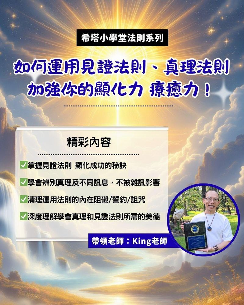 如何見證顯化成功的畫面,讓你掌握見證的所有細節,每個顯化都能成功甚至更好,輕鬆吸引想要的人事物來到身邊!老師會特別分享他在旅遊中成功讓自己房間升等、提早check in、還被送免費早餐等等的美好顯化見證方法🤩!