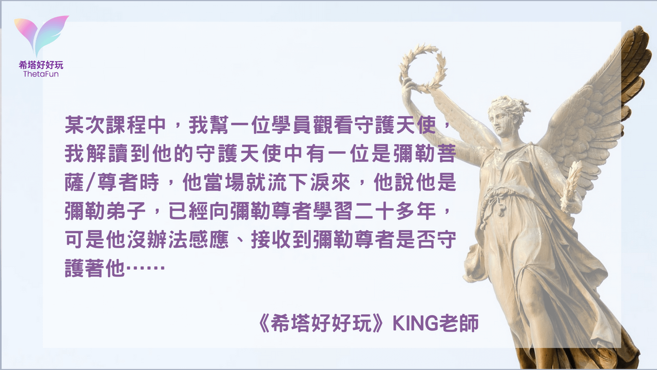 某次課程中,我幫一位學員觀看守護天使,我解讀到他的守護天使中有一位是彌勒菩薩/尊者時,他當場就流下淚來,他說他是彌勒弟子,已經向彌勒尊者學習二十多年,可是他沒辦法感應、接收到彌勒尊者是否守護著他,彌勒尊者給他的訊息是「智慧、精進、學習」和「相信自己」,當得到這些訊息時他非常感動,也更篤定自己學習的方向。
