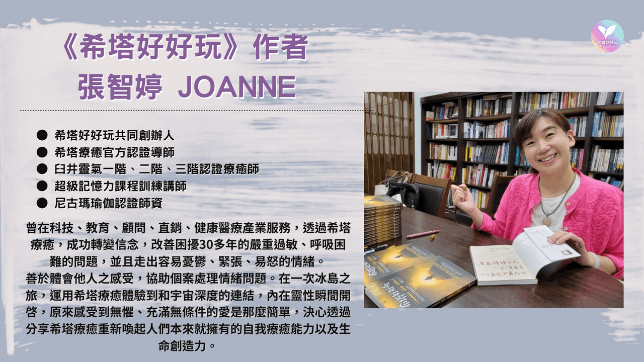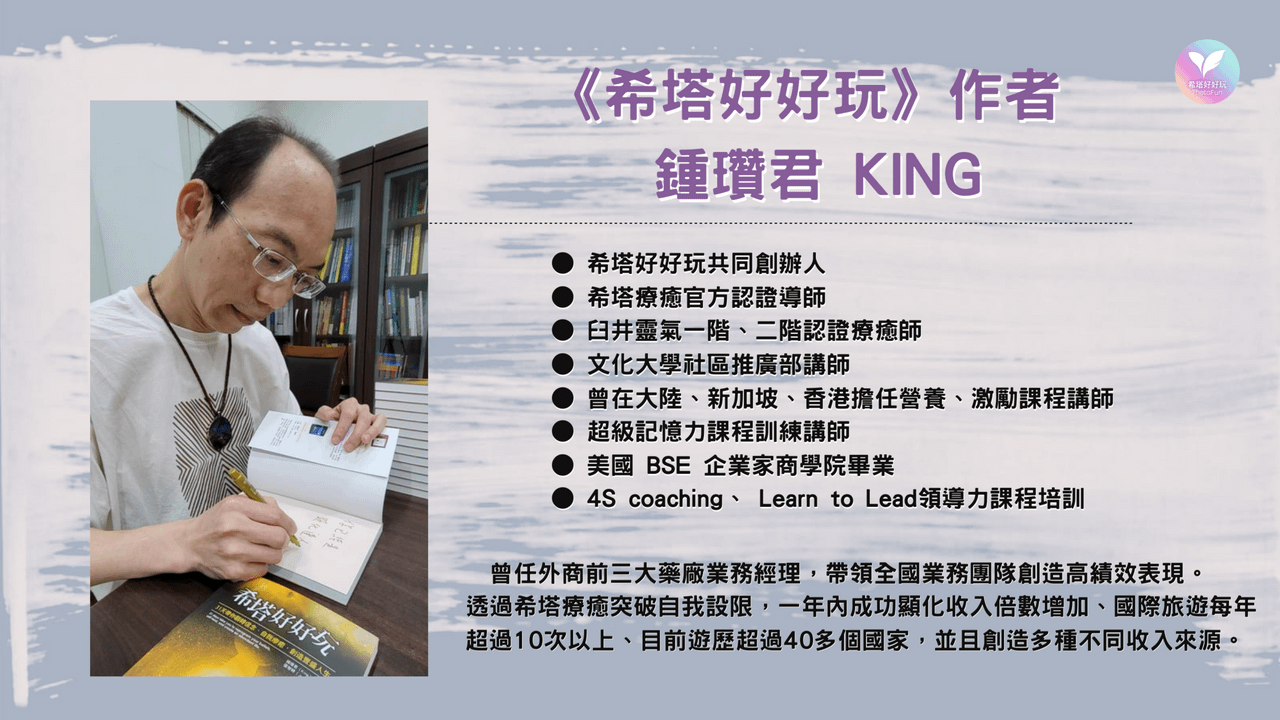 《希塔好好玩》作者King&Joanne老師是希塔療癒證書認證課程的導師,已經教導超過千位希塔療癒師、也培育了超過一百位學生成為希塔療癒導師。他們的教學經驗非常豐富,擁有跨國際的授課經驗(包含香港、美國、馬來西亞、新加坡、韓國、澳洲等國家),授課超過400堂以上的官方課程認證班(想更瞭解瞭解希塔療癒課程,歡迎參考希塔好好玩網站)。這本書集結了老師們豐富的個人經驗、教學分享以及許多美麗靈魂的真實生命故事。